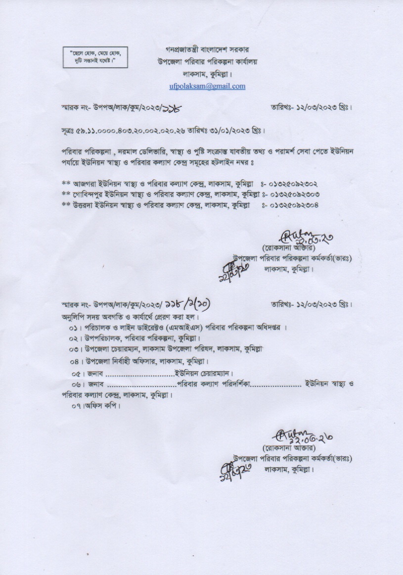 ইউনিয়ন স্বাস্থ্য ওপরিবার কল্যাণ কেন্দ্র এর হটলাইন নম্বর ( আজগরা,গোবিন্দপুর ও উত্তরদা)